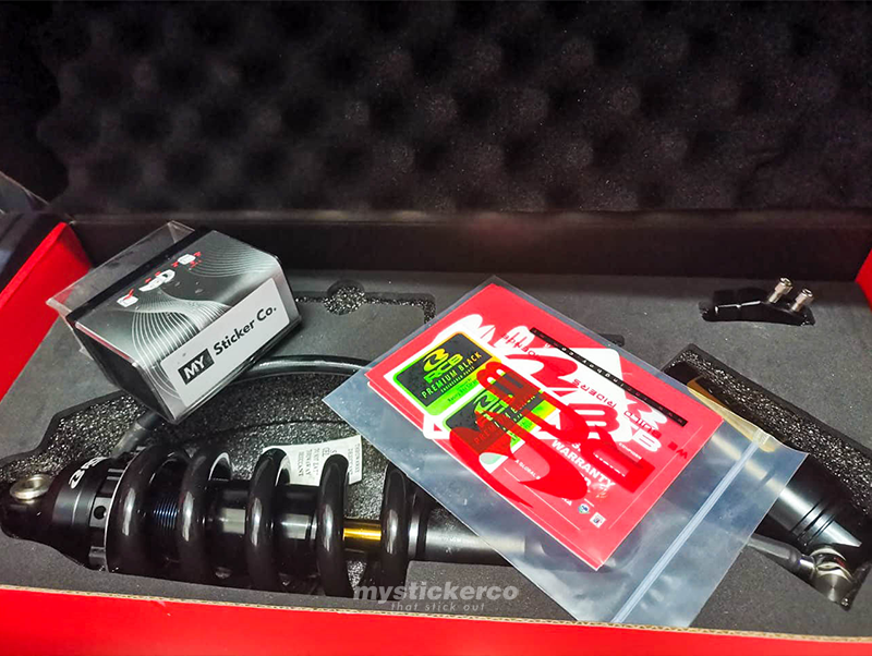 Lepas beberapa bulan pakai, absorber belakang dah mula jadi lembut. Jadi aku decided untuk tukar kepada monoshock RCB DB-2. Ianya disebabkan berat badan aku yang sekitar 85kg. Berdasarkan dari review2 pengguna lain, hanya model RCB ini (pada masa itu) yang menawarkan rate talaan yang banyak untuk orang yang berat macam aku ni.